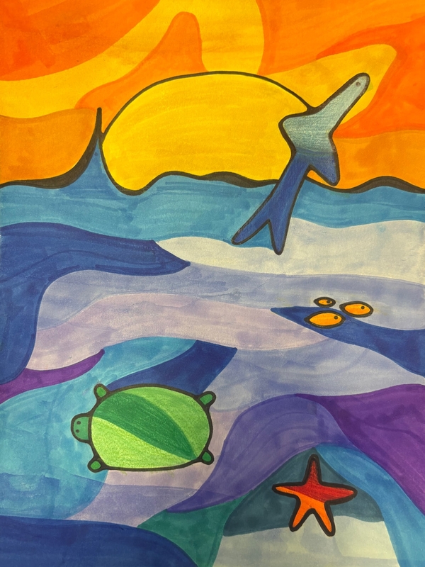Created using watercolor and marker, Clementina’s entry, Under the Sea (pictured), was selected as the Dragonfly Award winner! This award, given each year in honor of Petey Giroux, the first state and national coordinator for River of Words, reflects what the organization feels Petey would have chosen. The dragonfly, an indicator of clean water and a favorite of Petey's, symbolizes her free-spirited, fun-loving nature.