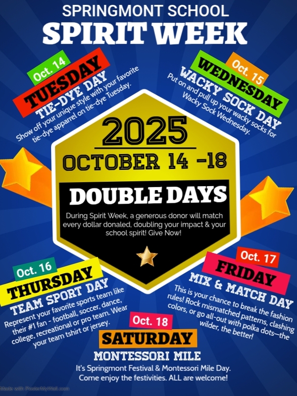 Speaking of spirit: Springmont’s Spirit Week is back! (See the attached flyer.) It’s a week of fun themed days designed to bring students, staff, and families together to celebrate what makes Springmont such a special place to learn and grow. Spirit Week just got even greater because it is also Double Days! Maybe you are not moved by the class competition, or maybe you want to double your impact. Well, here's your chance. Thanks to a generous donor, donations made during Spirit Week will be matched dollar for dollar, doubling the impact of your gift.